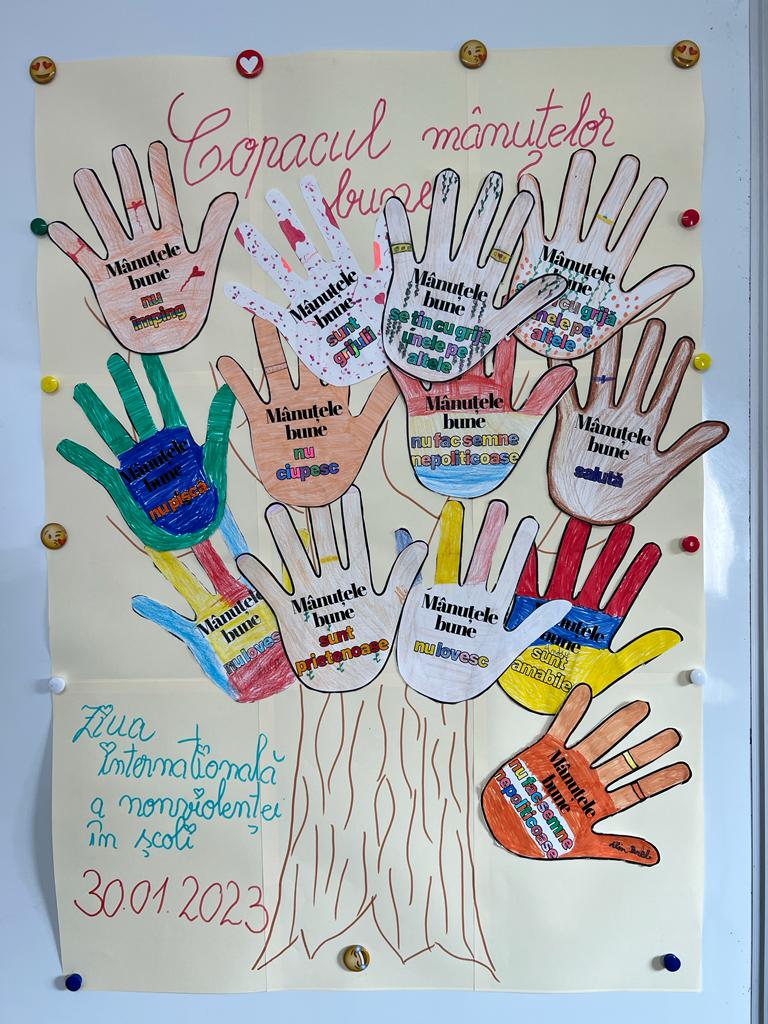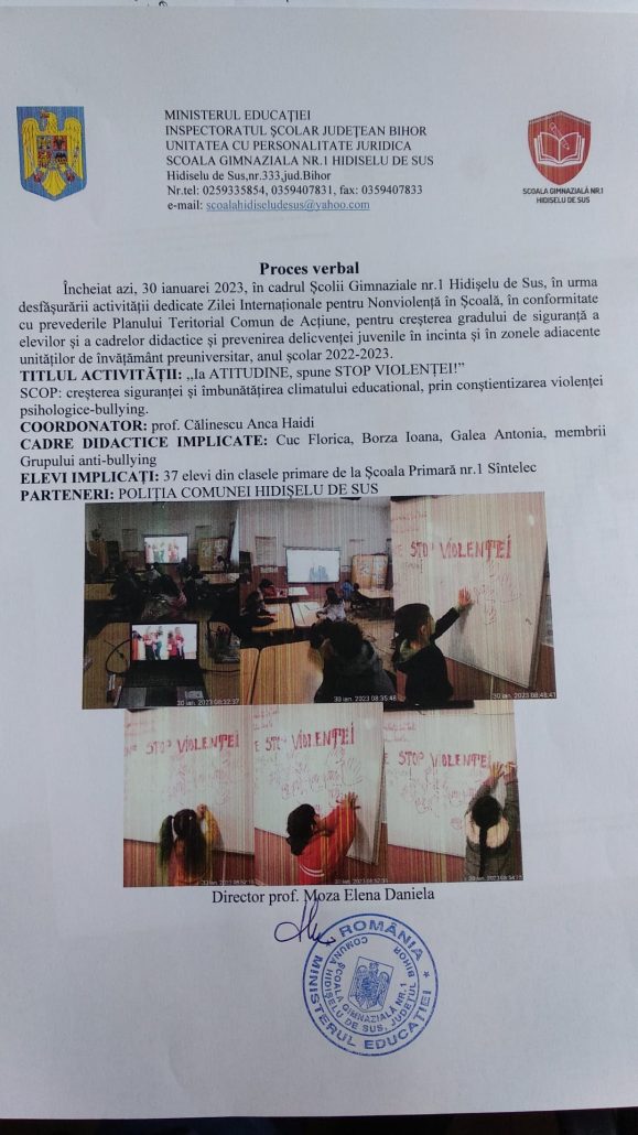 Cadrele didactice au prezentat elevilor atât semnificația zilei de 30 ianuarie cât și scopul acesteia și anume creșterea gradului de siguranță a elevilor și cadrelor didactice, prin conștientizarea fenomenului violenței psihologice-bullying. La activitate au luat parte elevii școlii, care, în funcție de nivelul de învățământ, au desfășurat diferite ateliere de lucru/ creație. Rezultatele acestor ateliere au fost panouri tematice care au fost expuse în holul școlii. Totodată, la activitate au fost prezenți pentru a purta discuții de conștientizare cu elevii, A.S.Lucaciu Mihai și AG. Morgoș Darius, din cadrul IPS Bihor-Post Poliție Comunal Hidișelu de Sus. Aceștia din urmă au prezentat aspecte legislative și modalități de prevenire a situațiilor cu risc victiminal, precum și modalități pentru prevenirea și reducerea riscurilor asociate consumului de alcool, droguri și substanțe psihoactive. Agenții de poliție prezenți la dezbatere au prezenta elevilor cauzele și implicațiile fenomenului de bullying și cyberbullying asupra dezvoltării psihice a minorului, inclusiv cu efect asupra dezvoltării unor comportamnete de tip predelictual și delictual.