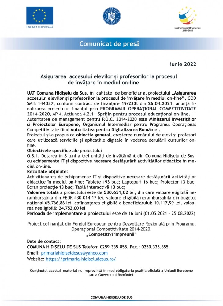 PNRR -„Asigurarea accesului elevilor și profesorilor la procesul de învățare în mediul online”